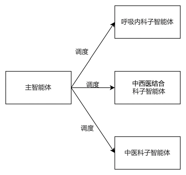 以如图1-7所示的AI医疗问诊项目为例,使用主从智能体构建多智能体系统的流程为:主智能体接收到用户请求后,会识别用户的问题属于哪一个科室的问题。如果用户的问题是“最近感冒了,嗓子疼”,则会调度呼吸内科子智能体处理该问题;如果用户的问题是“最近胃疼,想要中西医结合治疗”,则会调度中西医结合科子智能体和中医科子智能体并行对用户进行诊断。每个子智能体拥有独立的AI大模型和独立的执行过程,互不干扰;主智能体则只需在最后汇总结果,交付给用户。