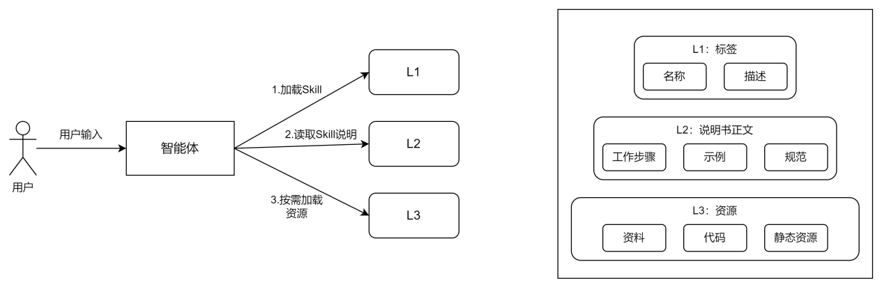 为避免此类问题,Skills设计了渐进式、按需加载的机制,如图1-8右侧部分所示,整个Skills的内容按照加载级别分为L1、L2、L3三个级别。图1-8左侧部分展示的则是智能体加载Skills的顺序。