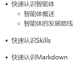 - 快速认识智能体 - 智能体概述 - 智能体的发展路线 * 快速认识Skills + 快速认识Markdown |