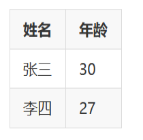 | 姓名 | 年龄 | | --------- | -------- | | 张三 | 30 | | 李四 | 27 | |