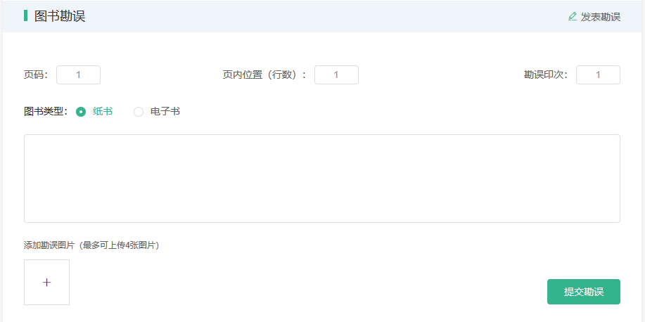 当您发现错误时,请登录异步社区(https://www.epubit.com),按书名搜索,进入本书页面,点击“发表勘误”,输入勘误信息,点击“提交勘误”按钮即可(见下图)。我们会对您提交的勘误信息进行审核,确认并接受后,您将获赠异步社区的100积分。积分可用于在异步社区兑换优惠券、样书或奖品。