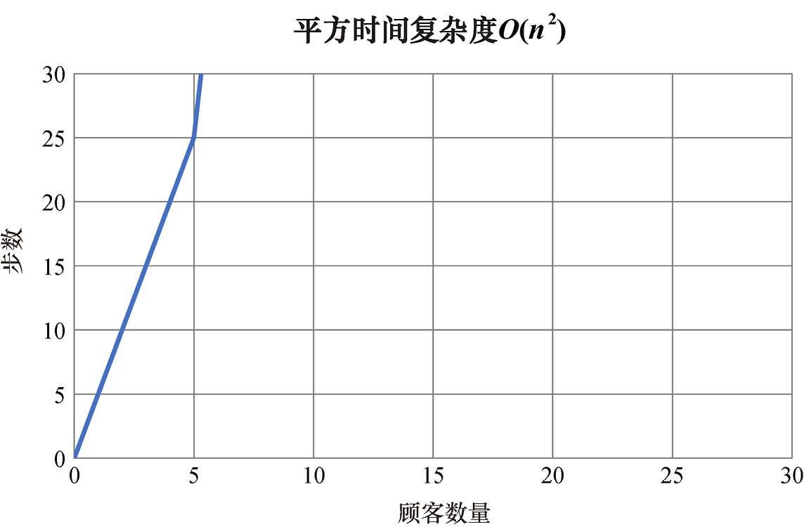 在图像上表示平方复杂度算法时,步数的增长比问题规模的增长速度更快(见图1.5)。