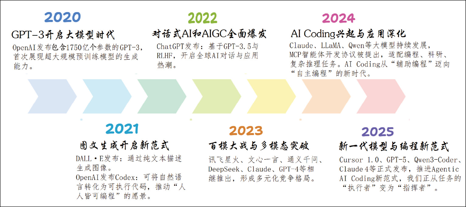 自2020年GPT-3发布以来,大语言模型进入超大规模预训练时代,其生成能力首次在自然语言理解与生成任务中展现出显著优势。2021年,DALL·E与Codex等模型相继提出,标志着“文本到图像”“自然语言到代码”的跨模态生成范式初步成型。2022年,ChatGPT的发布推动对话式AI与AIGC应用全面爆发,使大语言模型从研究工具走向大众化应用。2023年,多模态大语言模型快速演进,文本、代码、图像与语音的统一建模成为趋势。2024年起,AI Coding进入深度应用阶段,大语言模型开始支持复杂工程级推理与多步骤规划。预计2025年以后,新一代模型将进一步推动Agent化编程范式,实现从“辅助编程”向“自主协作式编程”的转变。图1-2展示了大语言模型近年的发展历程。