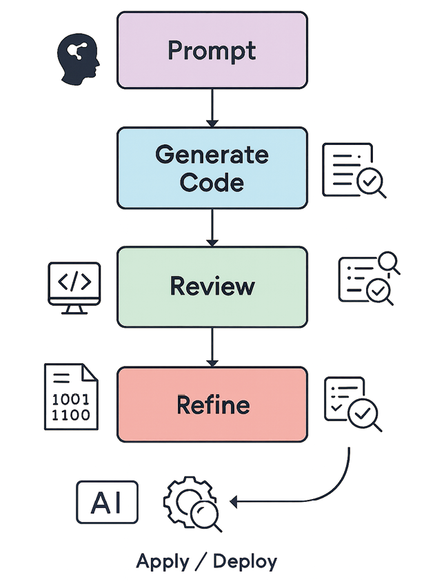 再次,进入Review(代码审查)阶段。生成的代码并非直接投入使用,而是通过人工或 AI 辅助的方式进行语义正确性、逻辑一致性、安全性与规范性的检查。该阶段相当于传统软件工程中的代码评审与测试前置环节,用于发现潜在缺陷与设计不合理之处。