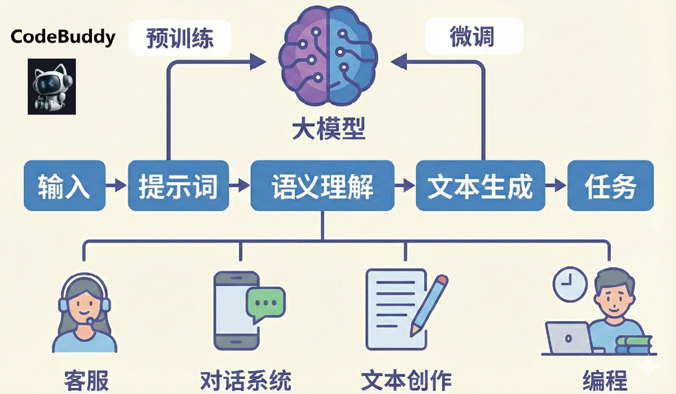 基于大语言模型的 AI Coding 通常遵循“需求表达—语义理解—代码生成—反馈优化”流程。开发者以自然语言或半结构化提示词描述开发目标,大语言模型对其进行语义解析并结合上下文代码与工程结构生成候选实现方案。随后,通过运行反馈、错误信息或人工评价对生成结果进行修正与优化。在工程化系统中,如 CodeBuddy,这一流程被嵌入IDE与开发管线中,支持项目级上下文理解、跨文件推理与持续交互式优化。其核心原理在于将大语言模型作为“智能编程协作者”,通过人机协同实现软件开发效率与质量的系统性提升。