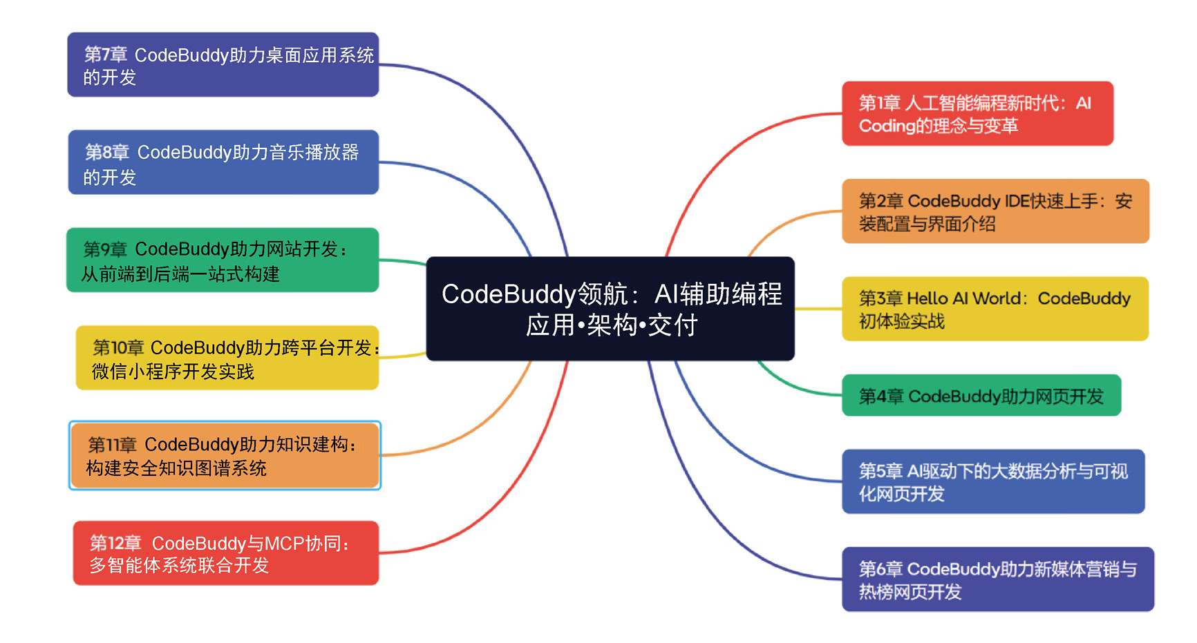 • 第11章 CodeBuddy助力知识建构:构建安全知识图谱系统和第12章 CodeBuddy与MCP协同:多智能体系统联合开发。作为全书的进阶部分,本部分聚焦知识图谱构建、多智能体协作与 MCP 体系,系统展示 CodeBuddy 如何与多智能体框架协同完成复杂系统设计。通过安全知识图谱、威胁情报分析与智能审稿系统等案例,揭示 AI Coding 从“代码生成工具”向“智能系统构建平台”的演进趋势。