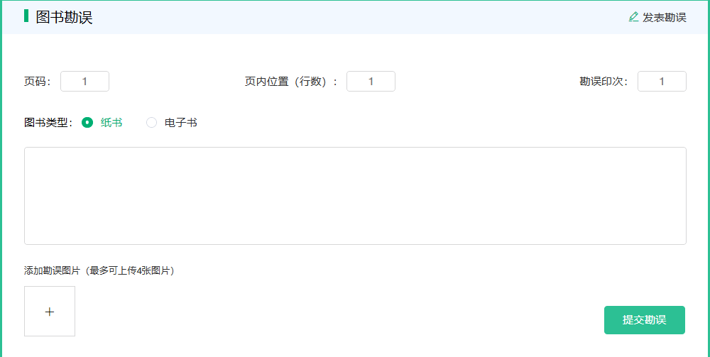 当读者发现错误时,请登录异步社区(https://www.epubit.com),按书名搜索,进入本书页面,单击“发表勘误”,输入勘误信息,单击“提交勘误”按钮即可(见下图)。本书的作者和编辑会对读者提交的勘误进行审核,确认并接受后,将赠予读者异步社区100积分。积分可用于在异步社区兑换优惠券、样书或奖品。